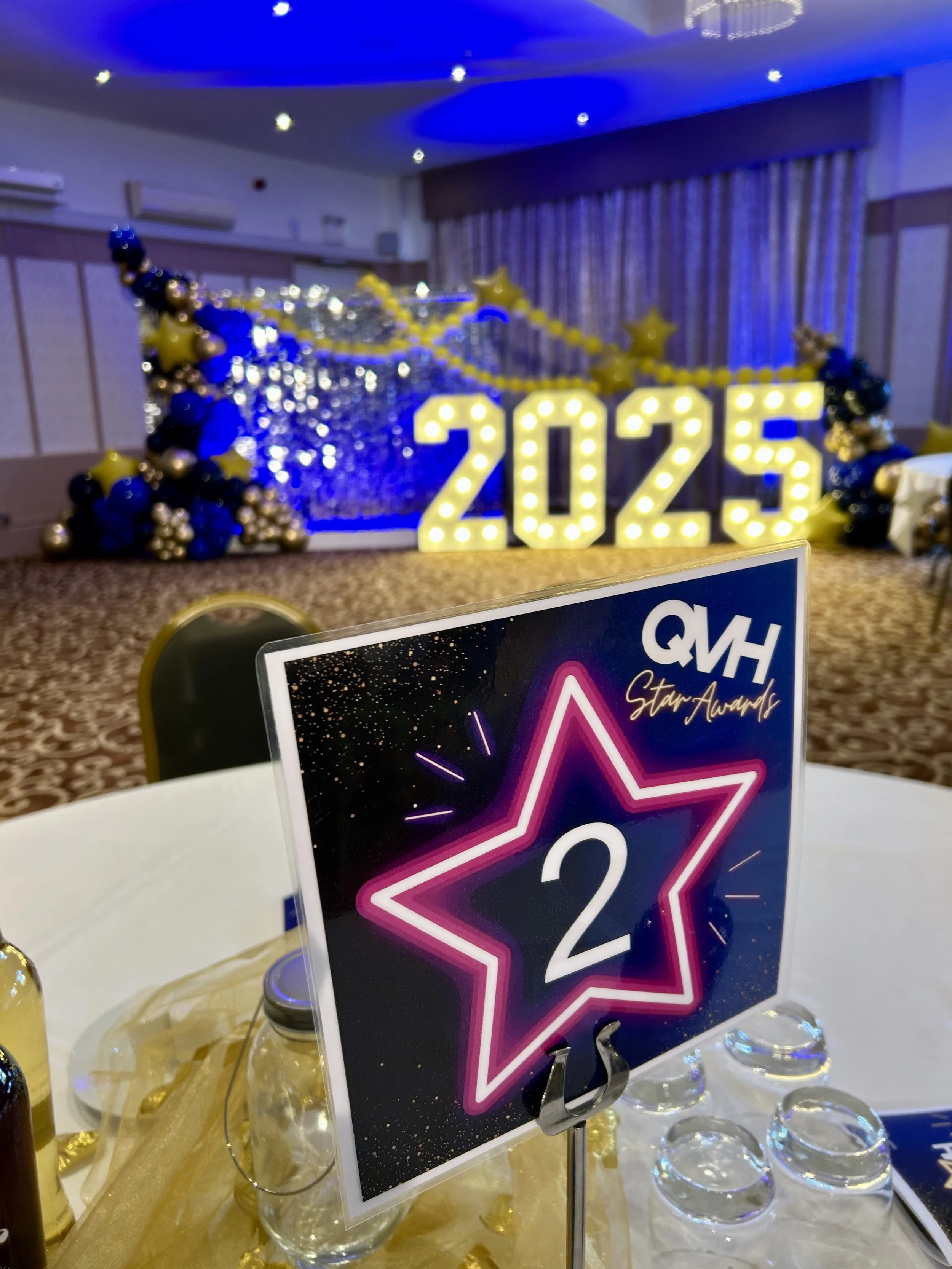 We were thrilled to be asked back by the Queen Victoria Hospital Charity for their Star Awards 2025. This year we provided our silver shimmer wall again, with our 4ft light up numbers, but changed the colour scheme to blue, gold and yellow. We think this display certainly brought the wow factor to the grand ballroom at The Felbridge Hotel.