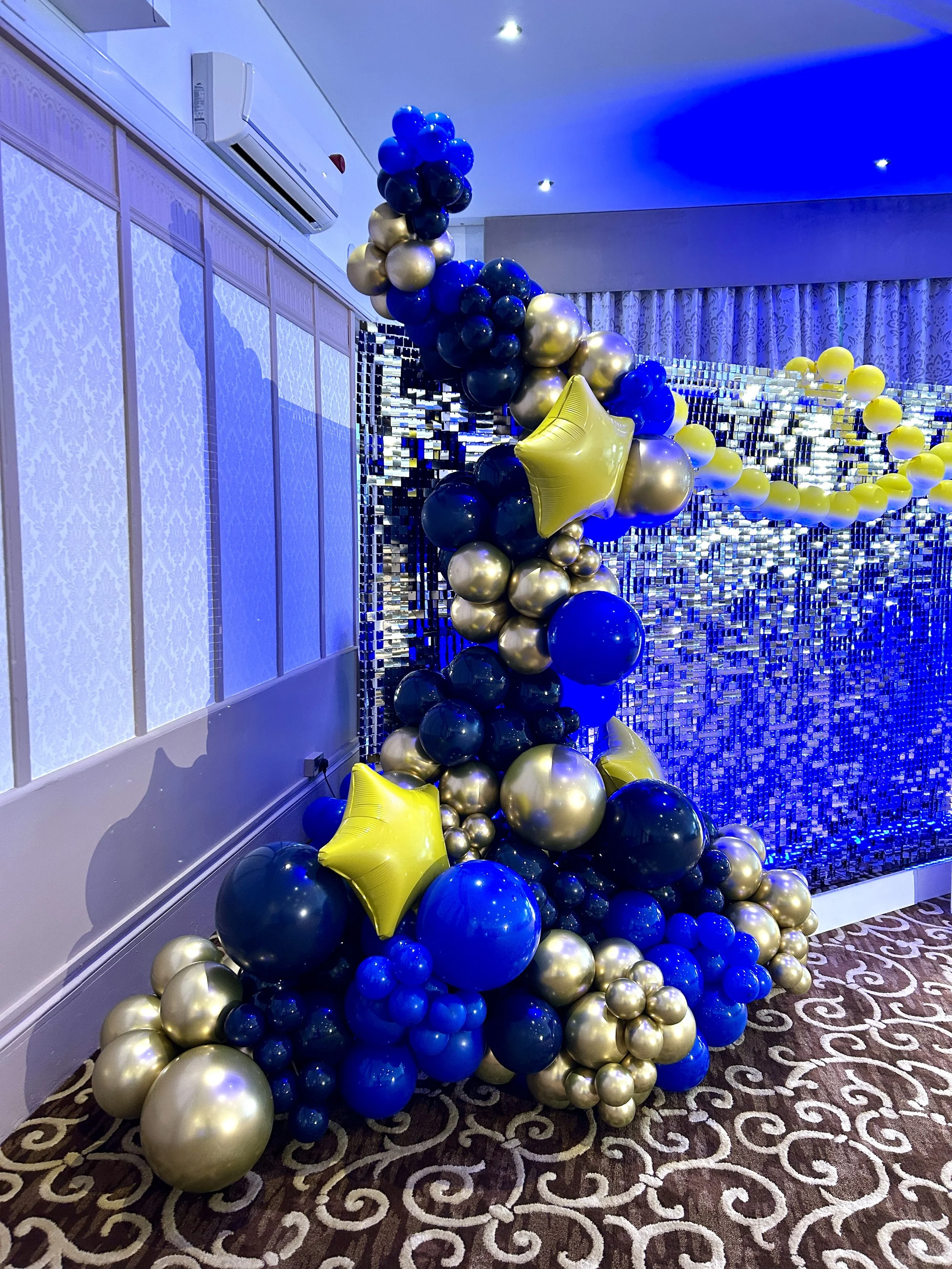 blue and gold balloon garland with yellow foil stars attached to a shimmer wall at the felbridge hotel